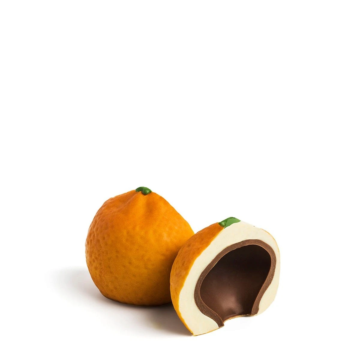 New for 2023, a realistic chocolate clementine, made with hollow milk chocolate smothered in a dimpled layer of white chocolate infused with clementine oil. Skilfully sculpted by hand in London using natural colours from plants and flowers and sustainably, ethically sourced cocoa.