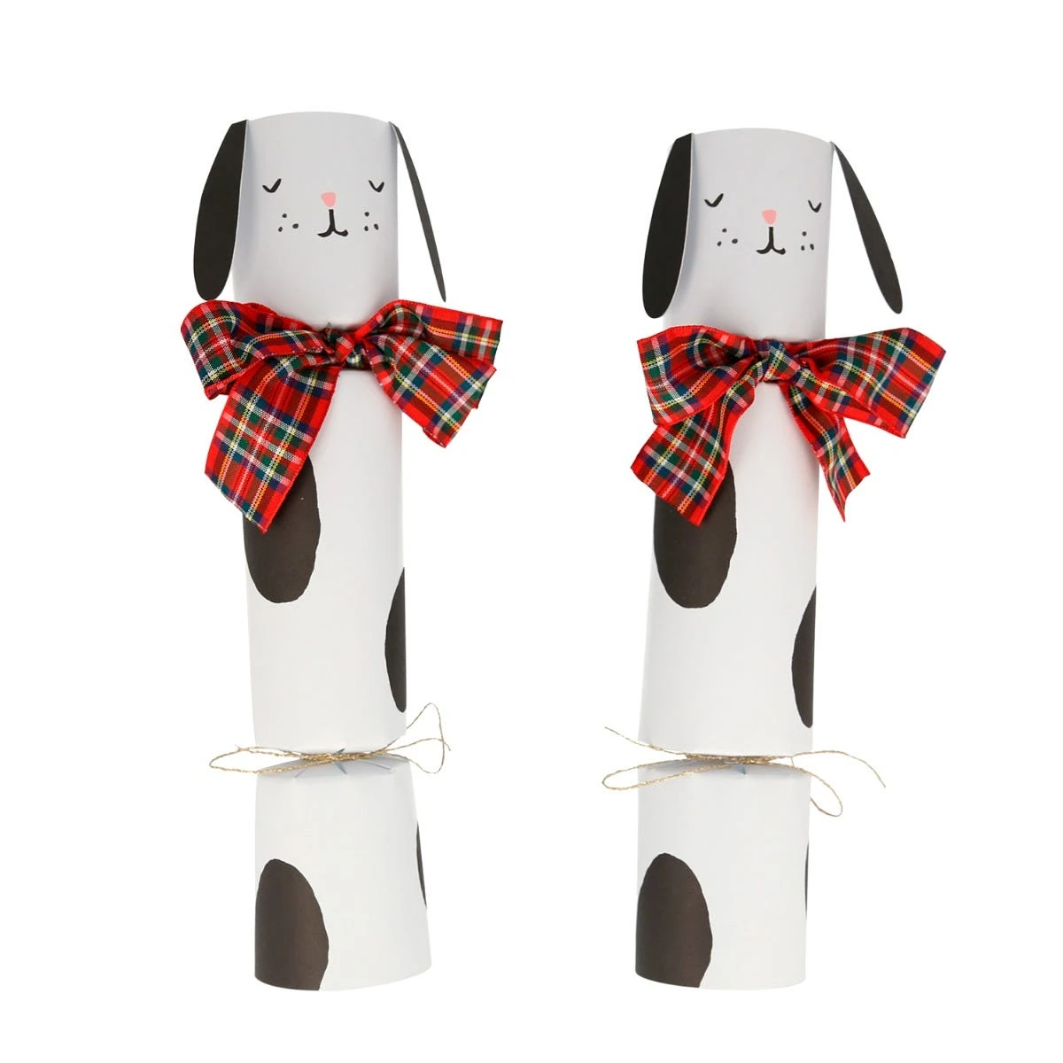 A set of 6 spotty dog crackers, each featuring tartan ribbons, floppy ears and metallic thread. Each contains a gold paper party hat, a joke and a colourful wooden dog brooch. Suitable for ages 8+.