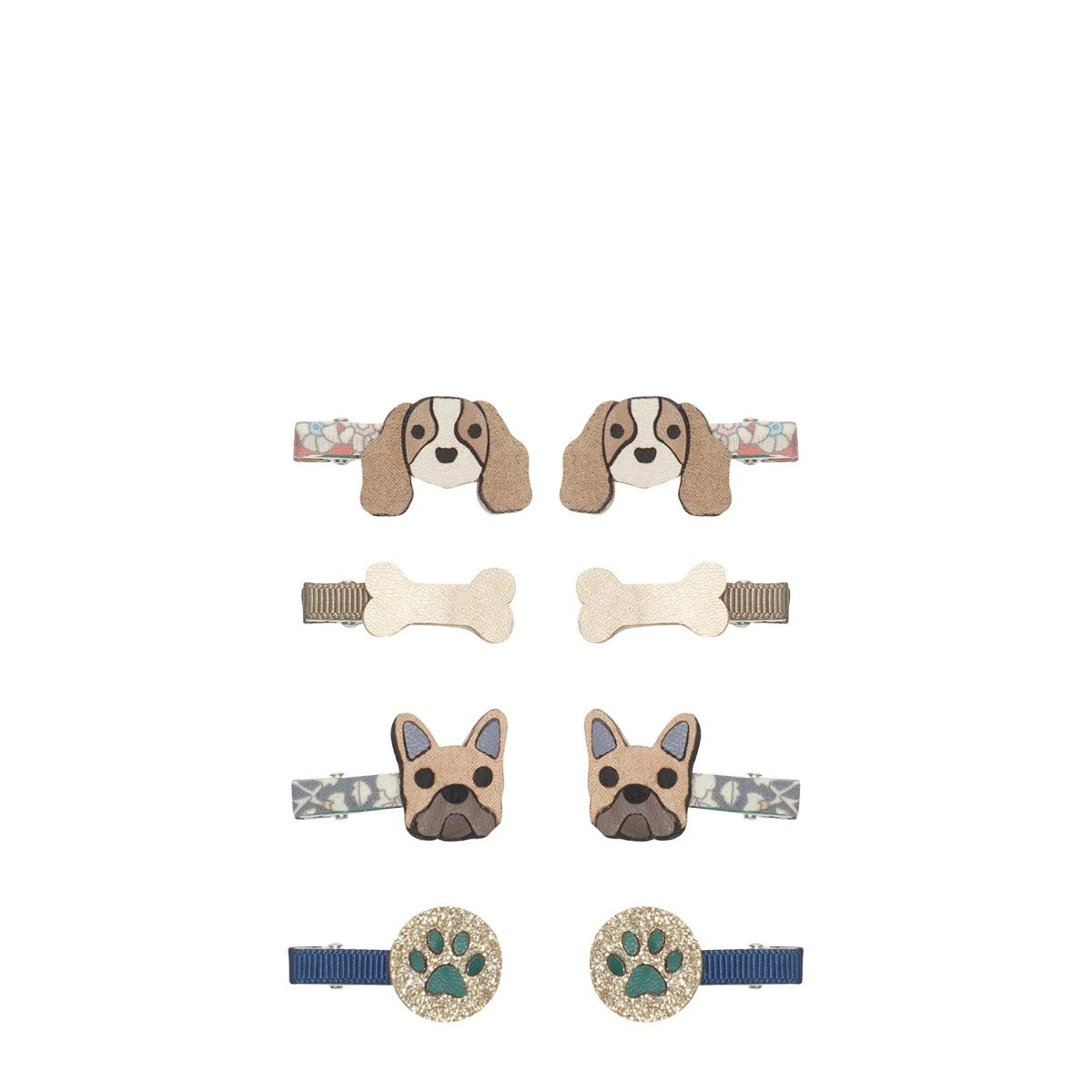 A set of eight mini hair clips decorated with matte, glittery and metallic dogs, dog bones and paws.