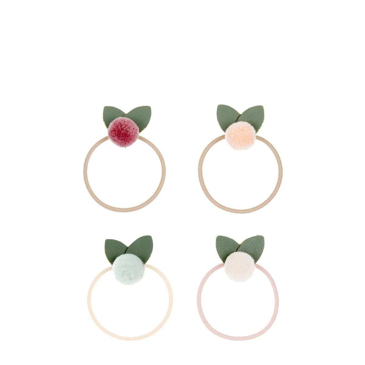 A pack of four pastel hair bands made from strong, stretchy elastic, featuring a flower pom pom design.