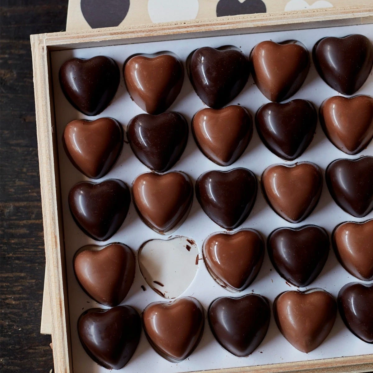 Presented in a wooden box, creamy milk and dark chocolate hearts filled with sumptuous, golden sea-salt caramel.