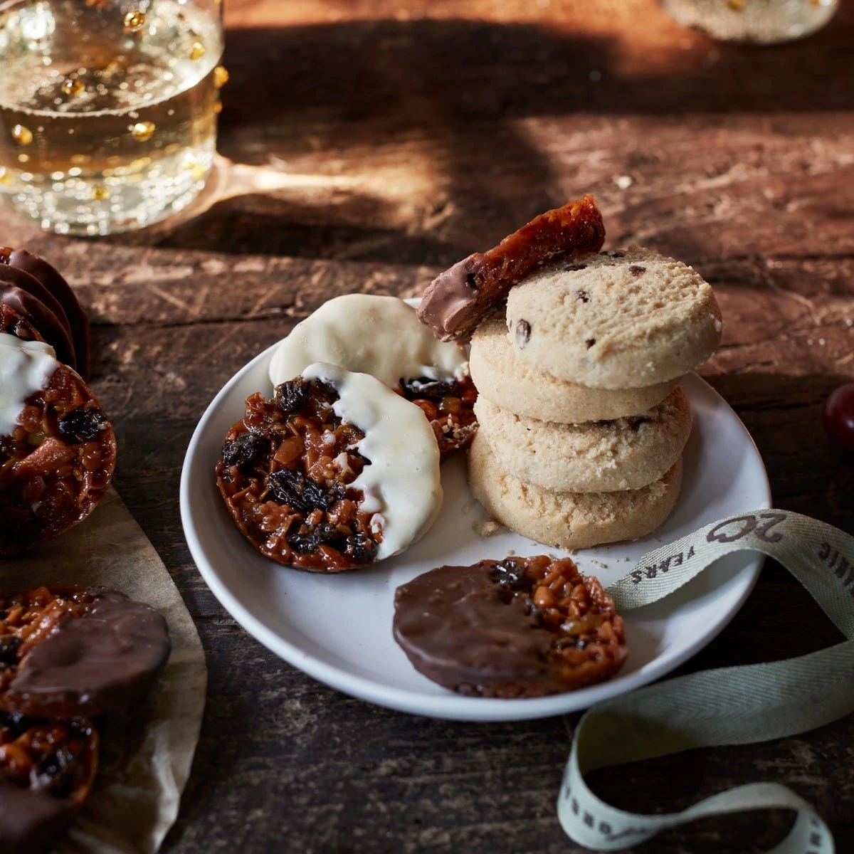 A selection pack of luxurious florentines; five dark, five milk and five white chocolate. An Italian inspired biscuit made by hand in our Patisserie on the farm.