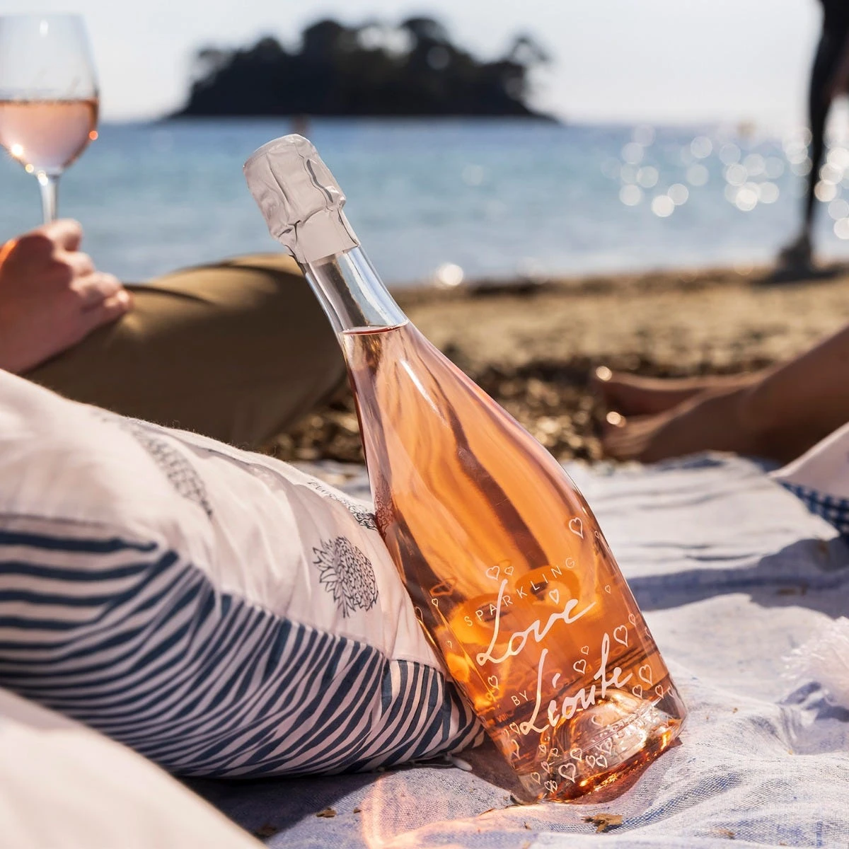 The distinctive bottle is adorned with hearts that resemble evaporating bubbles, indicating the gently effervescent wine within.