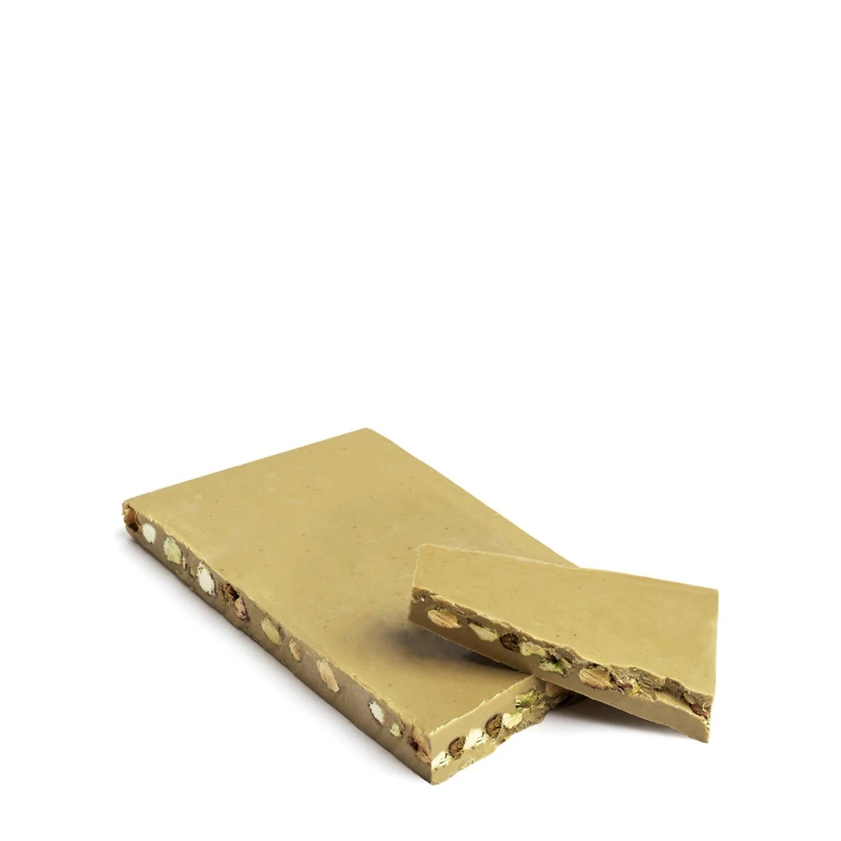 White chocolate with roasted and salted whole pistachios. A perfect sharing after dinner treat.